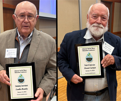 Two longtime leaders in Arkansas conservation and irrigation were recognized during the conference awards luncheon. Laudies Brantley of England, Arkansas, received the Outstanding Conservationist Award, and Dennis K. Carman of the White River Irrigation District was honored with the Friend of Conservation Award.