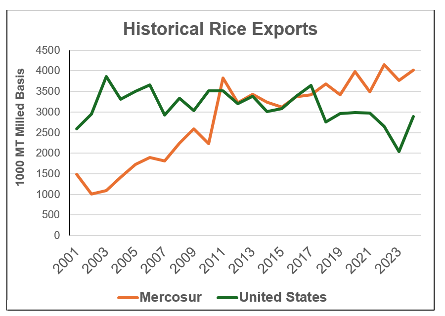The MERCOSUR region has surpassed the United States in rice exports in recent years. Except for Brazil, domestic consumption is relatively low, so their production is geared toward exports. They have significantly improved production practices and variety development, achieving extremely high yields and exceptional milling outturns. Their grain quality is excellent: uniform, translucent, and reliably loose-cooking. Traditional U.S. export markets in Mexico and Central America have steadily increased purchases from MERCOSUR suppliers.